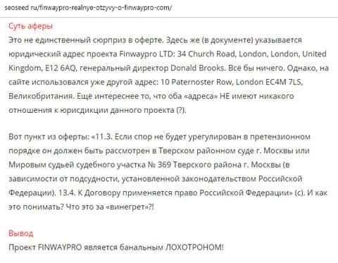 В статье, которую опубликовали на сайте seoseed ru, автор раскрыд подробно все аргументы, благодаря которым можно сделать трезвый вывод, что проект FinWayPro - это банальный лохотрон. Шарага не только имеет невыгодные услуги, а еще и дырки в договорах и адресах регистрации и реального месторасположения офиса.