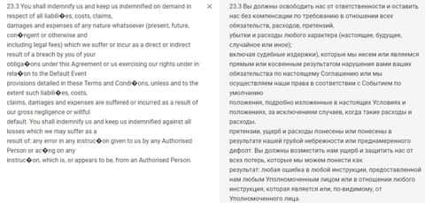 В клиентском соглашении также мошенники FinWayPro указали несколько пунктов, на которые они будут опираться в случае, если деньги со счета клиента пропадут, либо будут слиты по их вине. Шулера заранее предупреждают клиента, чтобы он не подавал на них в суд, если что-то из вышеперечисленного случится.