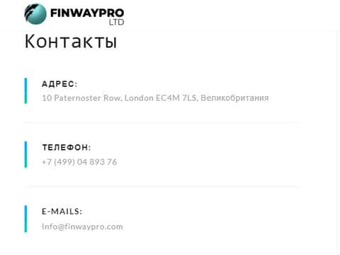 Чтобы связаться с конторой Фин Вэй Про, аферисты используют телефон, при чем российского оператора, электронную почту, а также указали адрес офиса в Лондоне. Такая открытость позволяет расположить к себе будущую жертву. Но как мы знаем, после того как жулики получают деньги клиента, ни один из каналов связи не отвечает. Их контакты: