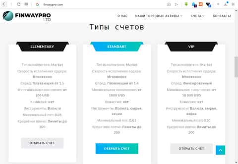 Если подробней рассмотреть сайт конторы FinWayPro, то сразу стоит отметить, что все смахивает на лохотрон с элементами Форекса. В предложениях услуг присутствует градация по количеству первоначального депозита, которые влияют на условия торговли и доходность. Так что берегитесь этого подвоха, если уж надумали вкладывать деньги в лохотрон Фин Вэй Про.