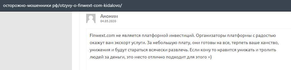 Еще один анонимный пользователь высказал свое мнение, что контора FinWext не является никакой платформой для инвестиции, а соответственно это обычный обман.