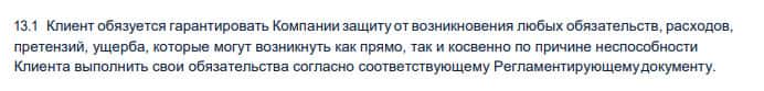 Лохотронская организация FinWext обязывает своего клиента, чтобы тот в свою очередь не обременял их на различные судебные разбирательства и претензии, и принимал все как есть.