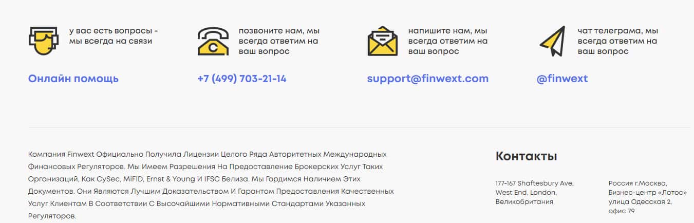 Чтобы связаться со своими клиентами, контора Фин Векст открыла несколько каналов, а именно электронную почту, телефон, телеграм и даже есть пару адресов: