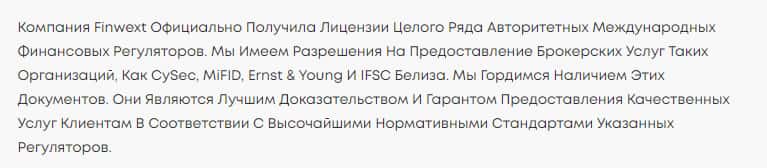 Мошенническая организация FinWext указывает на своем сайте то, что они имеют ряд лицензий, от различных регуляторов, хотя подтвердить это документально не смогли.