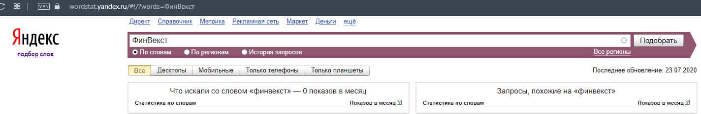 Другая версия русскоязычного бренда "ФинВекст" по запросам также не увенчалась успехом, так как шарлатаны вовсе не популярны в интернет-кругах.