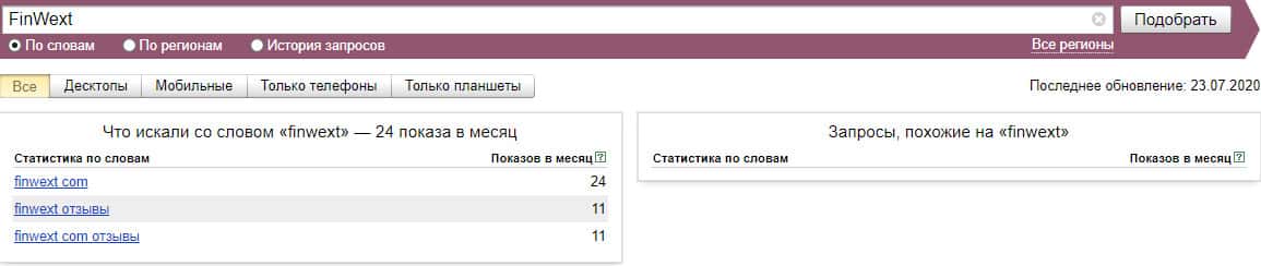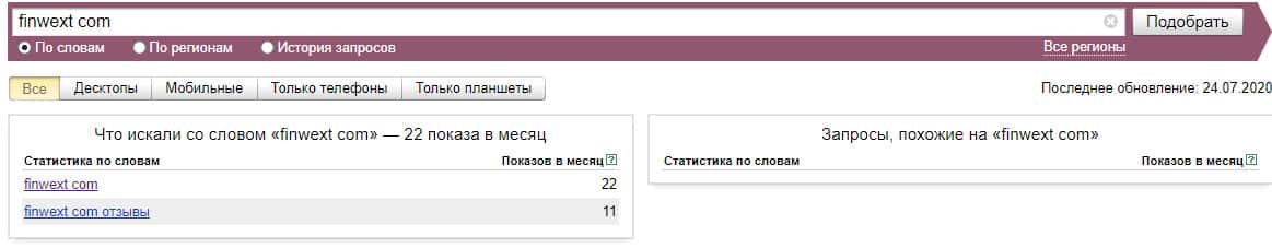 Что касается бренда "finwext com", то здесь шарлатанская кухня немного преуспела и смогла набрать в поисковой системе Яндекс 22 показа за месяц.