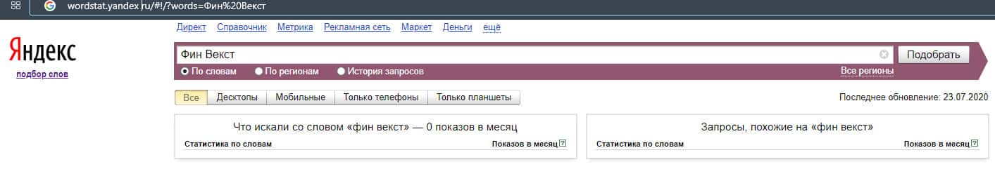 Если проверить насколько часто вводят бренд "FinWext", то здесь мы можем увидеть показатель в размере 0 показов в месяц.
