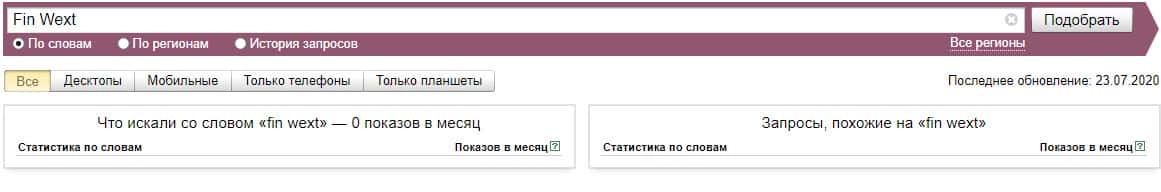 Ничтожные показатели бренда "Fin Wext" по версии, которые насчитывают ноль запросов за месяц в поисковой системе Яндекс.