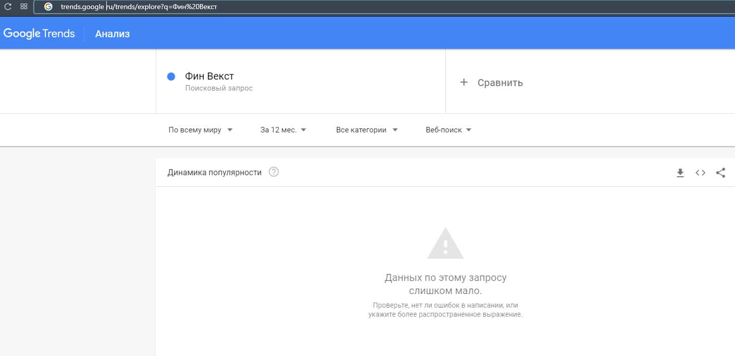 Ну и те же самые показатели, если ввести бренд лохотрона "Fin Wext" без точки. Мошенники по такому запросу не популярны в поисковой системе Гугл.