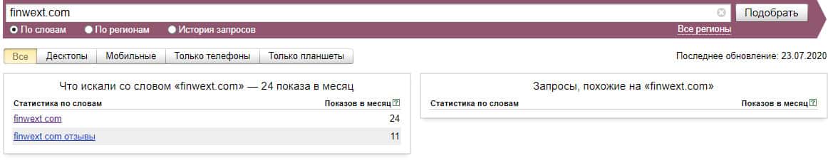 Судьба и бренда "finwext.com", который обозначает официальный сайт лохотрона, насчитывает 24 показа за последний месяц.