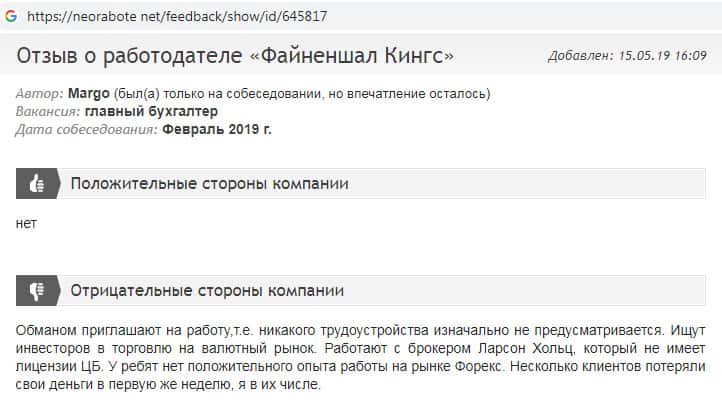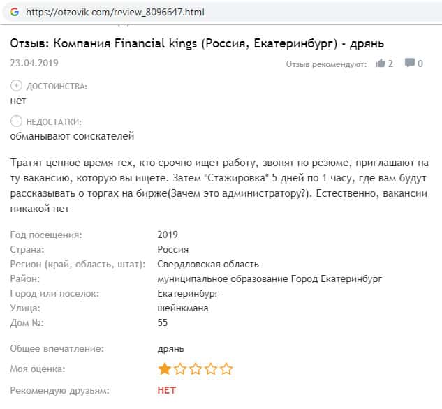 На информационном сайте otzovik com найдена информация о том, что компания Financial Kings якобы приглашают людей на работу. Для трудоустройства жулики рекомендуют пройти обучение. После чего оказывается, что Фейненшл Кингс ищут только трейдеров и инвесторов. Вообщем схема старая и действует только на не разбирающихся в этом людей.