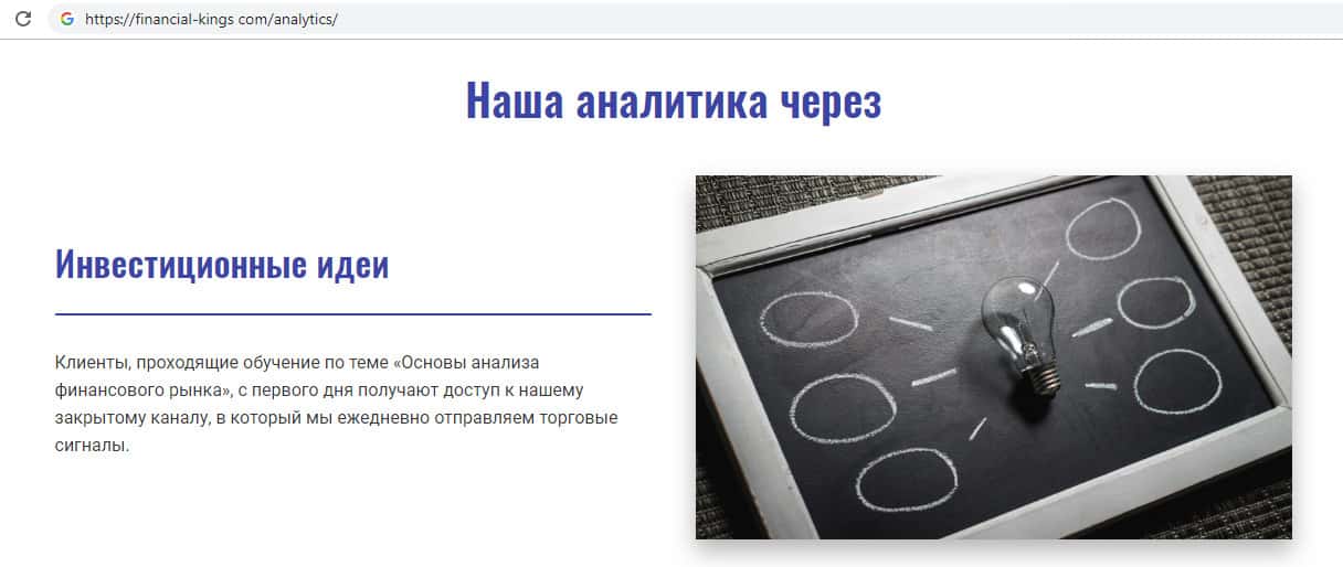 Сайт мошеннической организации Финанциал Кингс полностью на русском языке, абсолютно примитивный и не интересный. Аферисты Financial Kings создают видимость того, что предлагают пользователям обучение трейдингу, инвестированию, аналитике и так далее.
