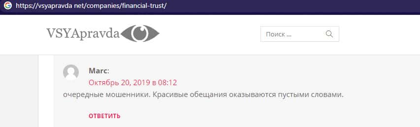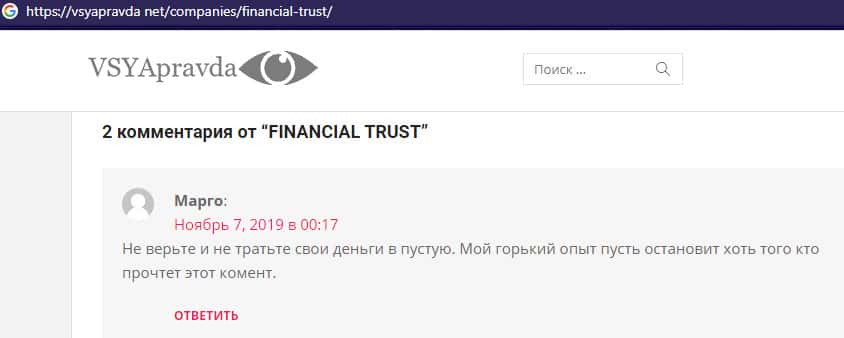 На ниже расположенном изображении вы можете наглядно увидеть реальный негативный отзыв в сторону мошенников Financial-Trust Ru с веб-сайта всяправда нет от очередного наивного пользователя сети интернет, который повелся на лапшу на уши в исполнении жуликов Файненшл Траст и по итогу был кинут жуликами, которые слили пользователя.