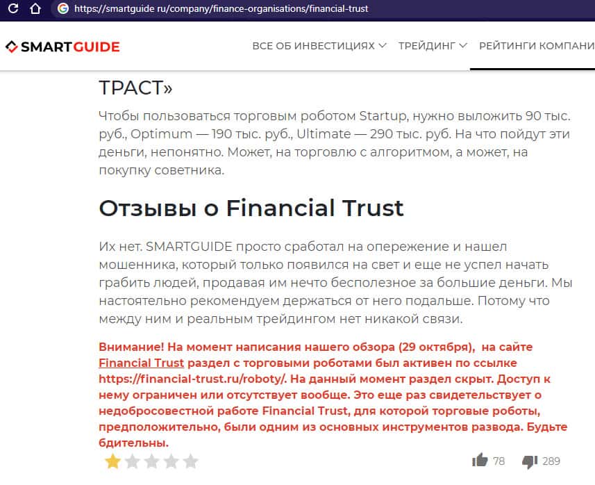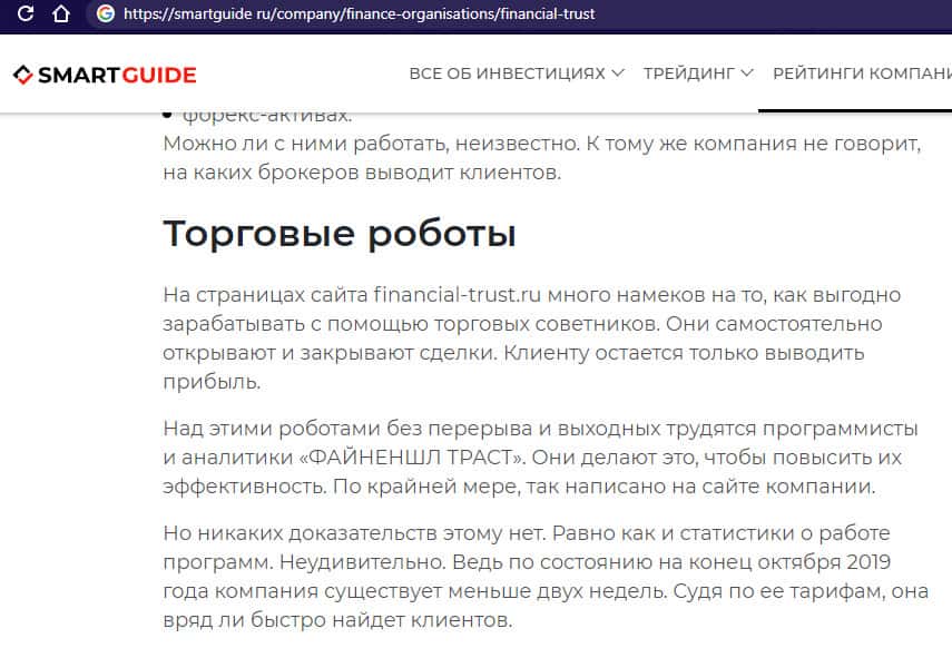 - Негативная статья о жуликах Файненшл Траст с портала smartguide ru