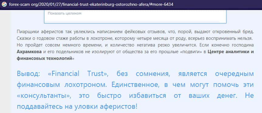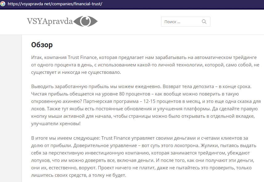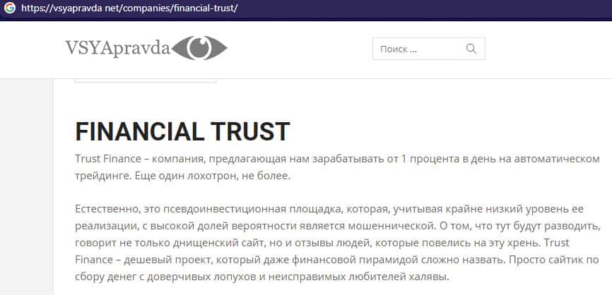 Негативная статья о лохотроне Файненшл Траст с веб-сайта vsyapravda net
