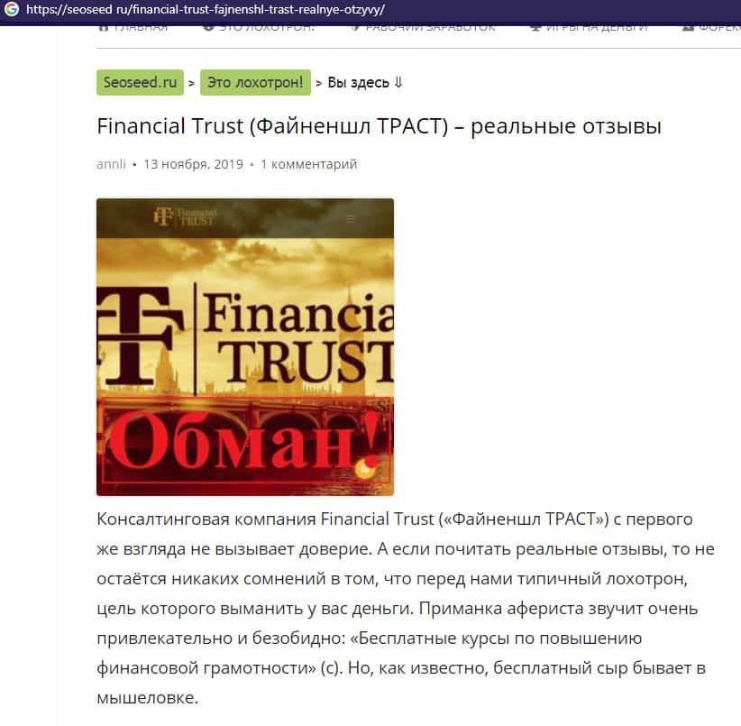 seoseed ru - сайт со статьей о лохотроне Financial-Trust Ru