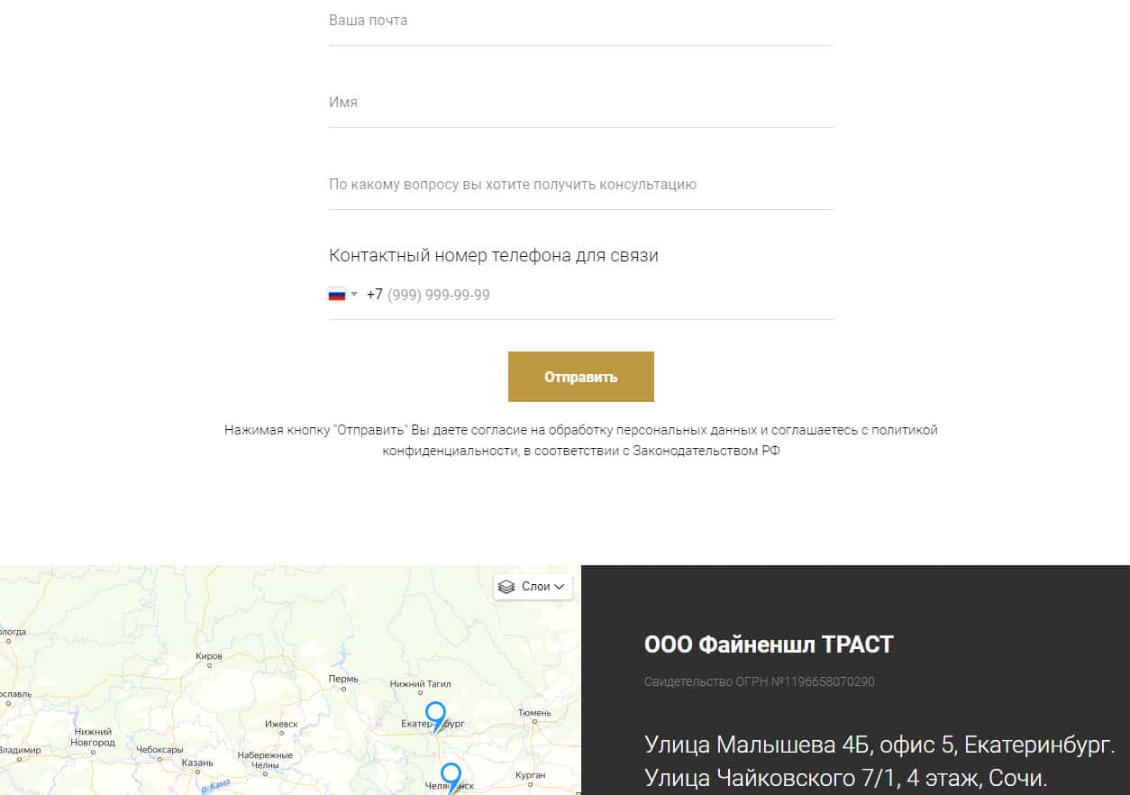 Завершается сайт у жулья Файненшл Траст вполне ожидаемо, а именно формой для связи аферистов Financial-Trust Ru с наивной клиентурой сети интернет, а так же весьма сомнительными контактами проходимцев Файненшл Траст. На изображении, расположенном ниже, вы можете увидеть окончание подвального сайта аферистов Financial-Trust Ru.