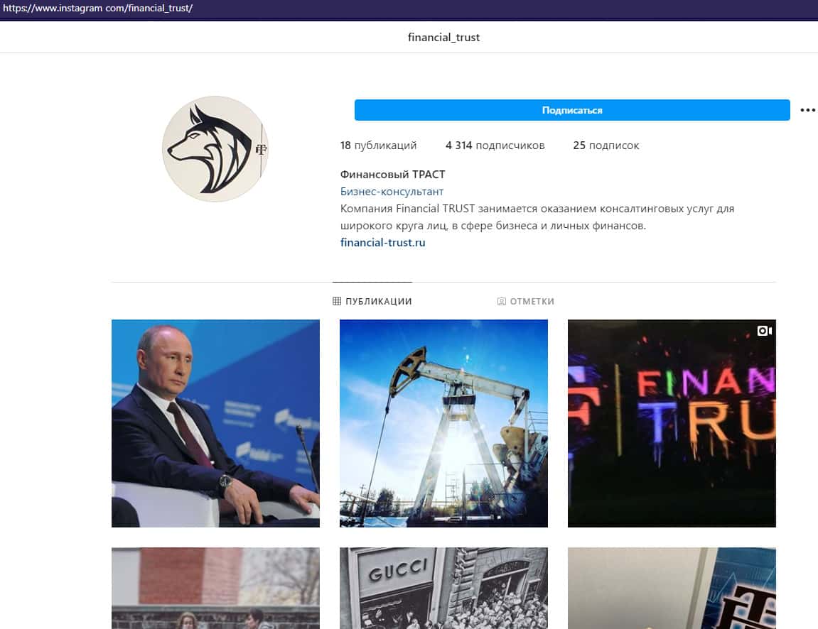 Имеется у шулеров Financial-Trust Ru и страница в нынче популярной социальной сети Инстаграм, где у аферистов Файненшл Траст всего несколько тысяч подписчиков, что говорит о не особом внимании шулеров Financial-Trust Ru к данной социальной сети или же нежелании тратить на нее средства. На изображении ниже вы можете увидеть страницу жулья.