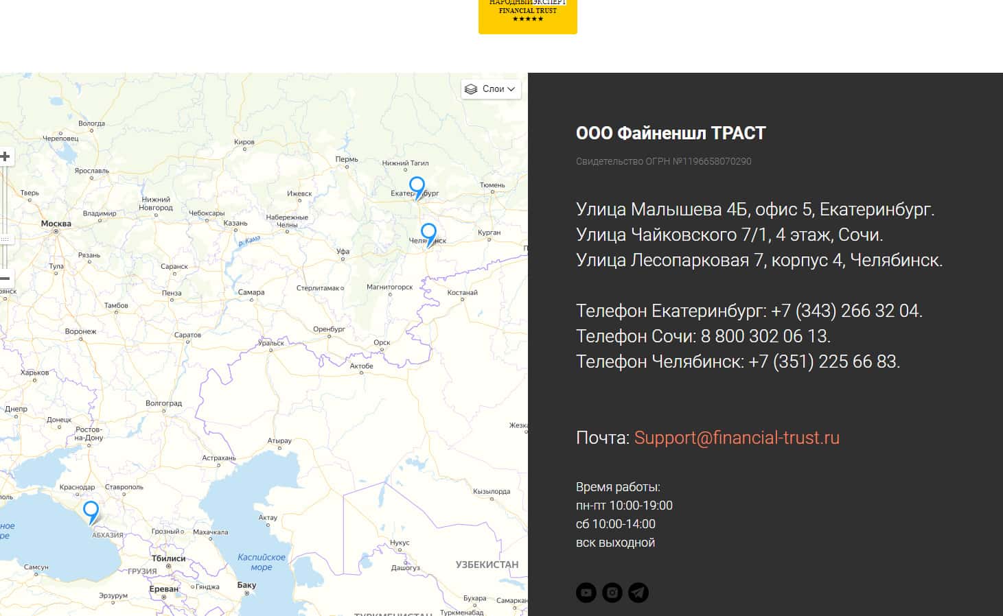 Под свои довольно сомнительные контакты аферисты Financial-Trust Ru не отводили отдельный раздел своего сайта, вместо этого шулера Файненшл Траст разместили свои контакты в конце подвального сайта. Данных контактов у аферистов Financial-Trust Ru довольно мало, что говорит об определенно малом бюджете шулеров. Итак контакты жуликов: