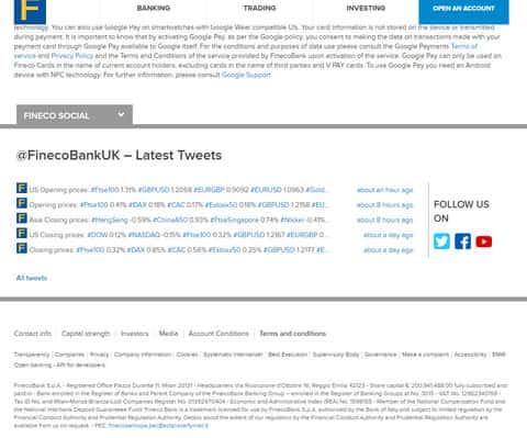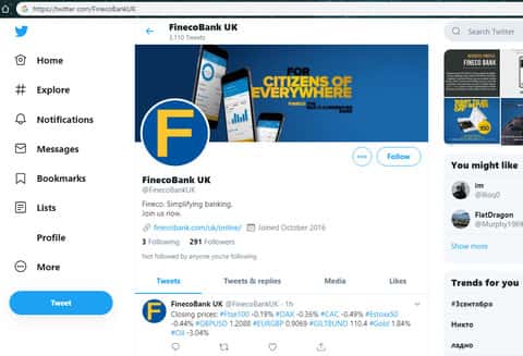 Имеется у лохотрона Fineco и страница в социальной сети Твиттер, где жулье Финеско уже решили не тратить средства на их раскрутку и подписчиков, поэтому у лохотрона Fineco здесь всего пару сотен подписчиков, активность которых на аккаунте у жуликов Финеко крайне низкая. На изображении ниже вы можете увидеть внешний вид страницы шулеров Fineco в социальной сети Твиттер.