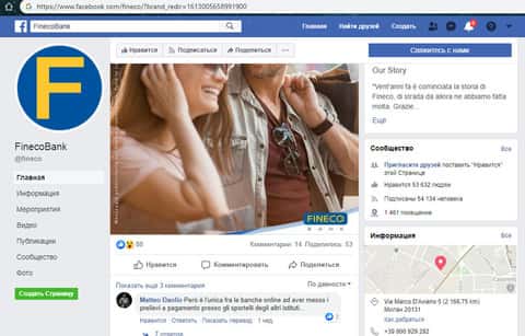 Дабы соответствовать современным трендам мошенники Fineco обзавелись страницами в различных социальных сетях, одной из которых стал Facebook, где лохотрон Финеко не пожалел денег и накрутил около полусотни тысяч подписчиков. На изображении, расположенном ниже, вы можете наглядно увидеть страницу аферистов Fineco в социальной сети Фейсбук.
