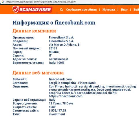В связи с мошеннической и противозаконной деятельностью мошенников Fineco их реальные руководители предпочитают анонимность дабы избежать ответственности со стороны правоохранительных органов. Информацию о самом же сайте лохотрона Финеско можно узнать с помощью портала scamadviser com, которую вы можете увидеть на изображении, расположенном ниже.