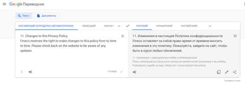 Завершается же политика конфиденциальности у мошенников Финеко довольно стандартно, а именно информацией о том, что лохотрон Fineco может в любой момент по своему усмотрению изменить данную политику конфиденциальности без предварительного уведомления. На изображении ниже вы можете увидеть окончание политики конфиденциальности.