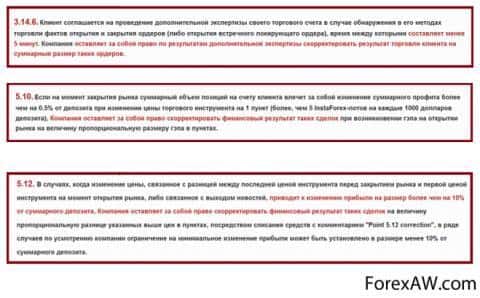- пункты, которые защищают брокера от вполне прибыльных для трейдера сделок.