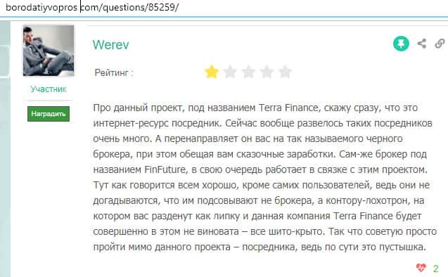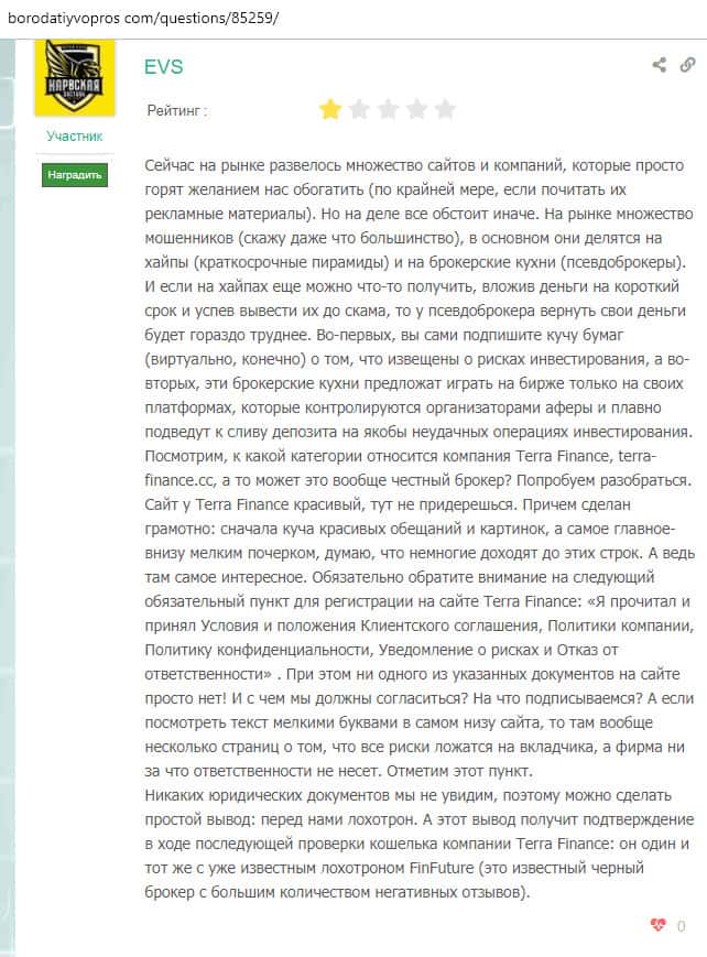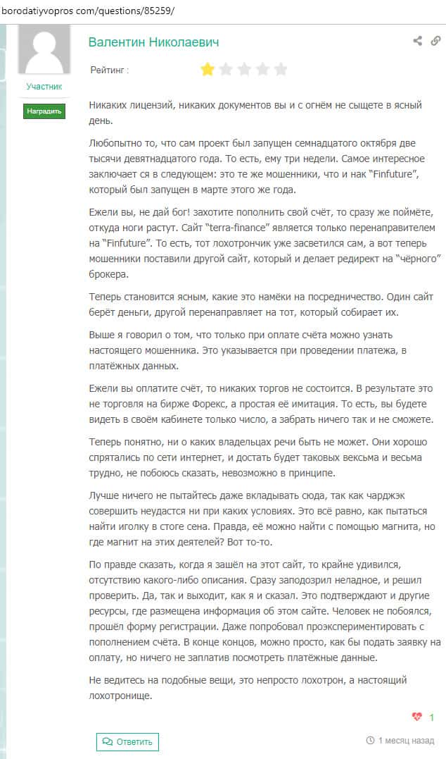 Согласно тексту следующего отзыва, автор уверяет, что сайт конторы Терра Финанс является только перенаправителем в брокерскую кухню FinFuture. При чем и та и другая кухня имеет одну и ту же компанию-учредителя. Поэтому можно смело сказать, что шаражники замешаны в мошеннических схемах и кинули уже не мало людей.