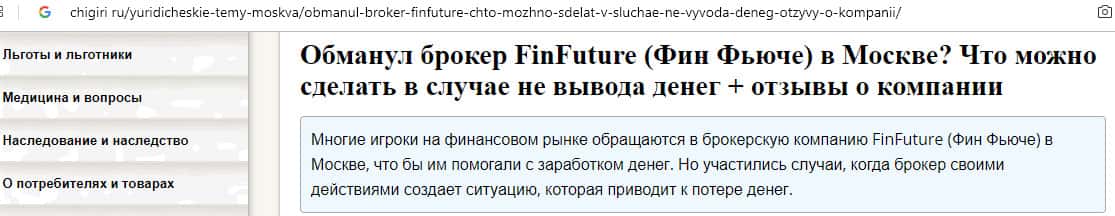Далее представлена статья, в которой рассказывается, что же нужно делать, если вас кинут в мошеннической организации FinFuture. Обычно они банально не желают отдавать деньги и не выходят на связь. Также есть кухонные методы слива депозитов, в таком случае трейдер будет думать, что слил все деньги сам.