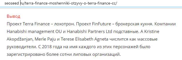 Согласно статье, которая опубликована на сайте seoseed ru, мошенники FinFuture являются брокерской кухней, которая смежна с одним из известных лохотронов под названием Terra Finance. Компании Hanabishi management OU и Hanabishi Partners LTD являются подставными компаниями. И также есть некоторая информация о псевдо-руководителях: