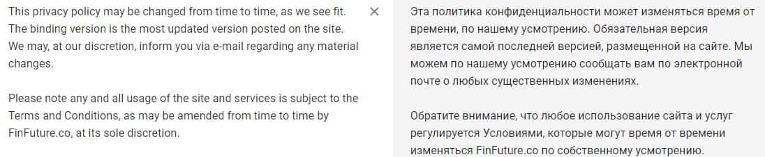 Документ о политике конфиденциальности шараги FinFuture очень странный, так как они указывают, что имеют право делиться с личными данными клиента с третьими лицами. Также жулье указывает, что они в любой момент могут поменять текст данного документа не уведомив при этом клиентов.