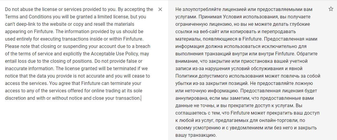 В клиентском соглашении, которое опубликовала на сайте у себя дилинговая контора Фин Фьюче, есть несколько моментов из-за которых не желательно с ними работать. Во-первых они рассказывают о какой-то лицензии, которой по сути нет, поэтому есть вероятность, что договор тупо скопирован. А во-вторых, у лохотрона FinFuture есть право закрыть счет без объяснений.