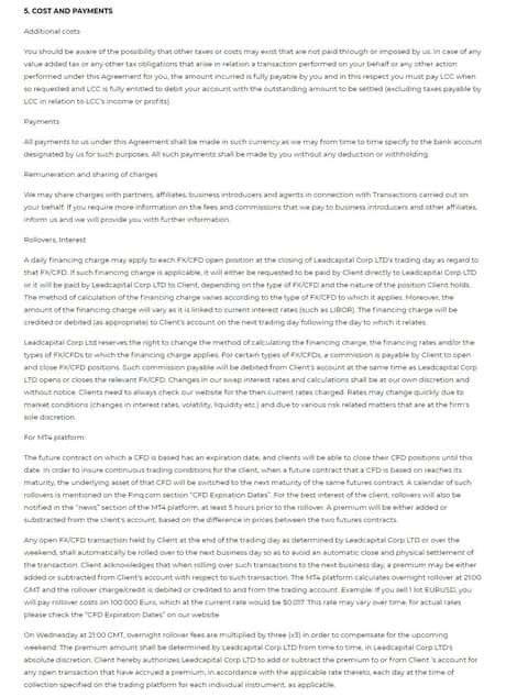 Расходы клиентов компании ФИН Кью прописаны в нормах, утвержденных в пятом разделе клиентского соглашения данного форекс-лохотрона.