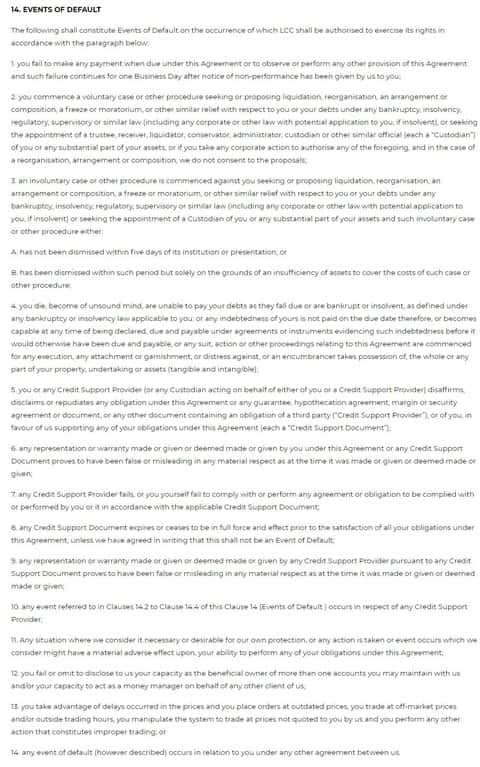 Дальнейшие ловушки мошенников в лице брокерской компании ФИН Кью, которые они припрятали в разделе 14 собственного соглашения.