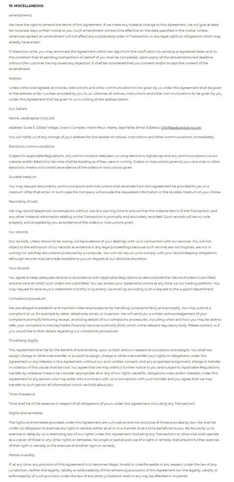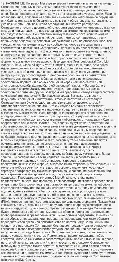 На публикации ниже предоставлен скрин раздела под номером девятнадцать регламента компании ФИН Кью.