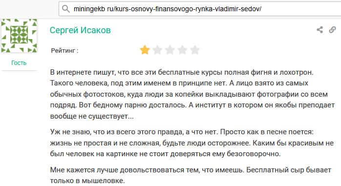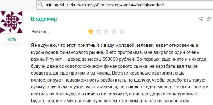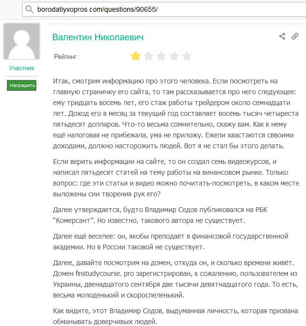 Основателя лохотронского проекта FinStudyCourse Pro Владимира Седова на нормальных ресурсах везде называют псевдогуру, потому что никаких подтверждающих данных о том, что он действительно делает то, о чем говорит, нет. Просто какой-то очередной мошенники под вымышленным именем разводит людей на деньги.