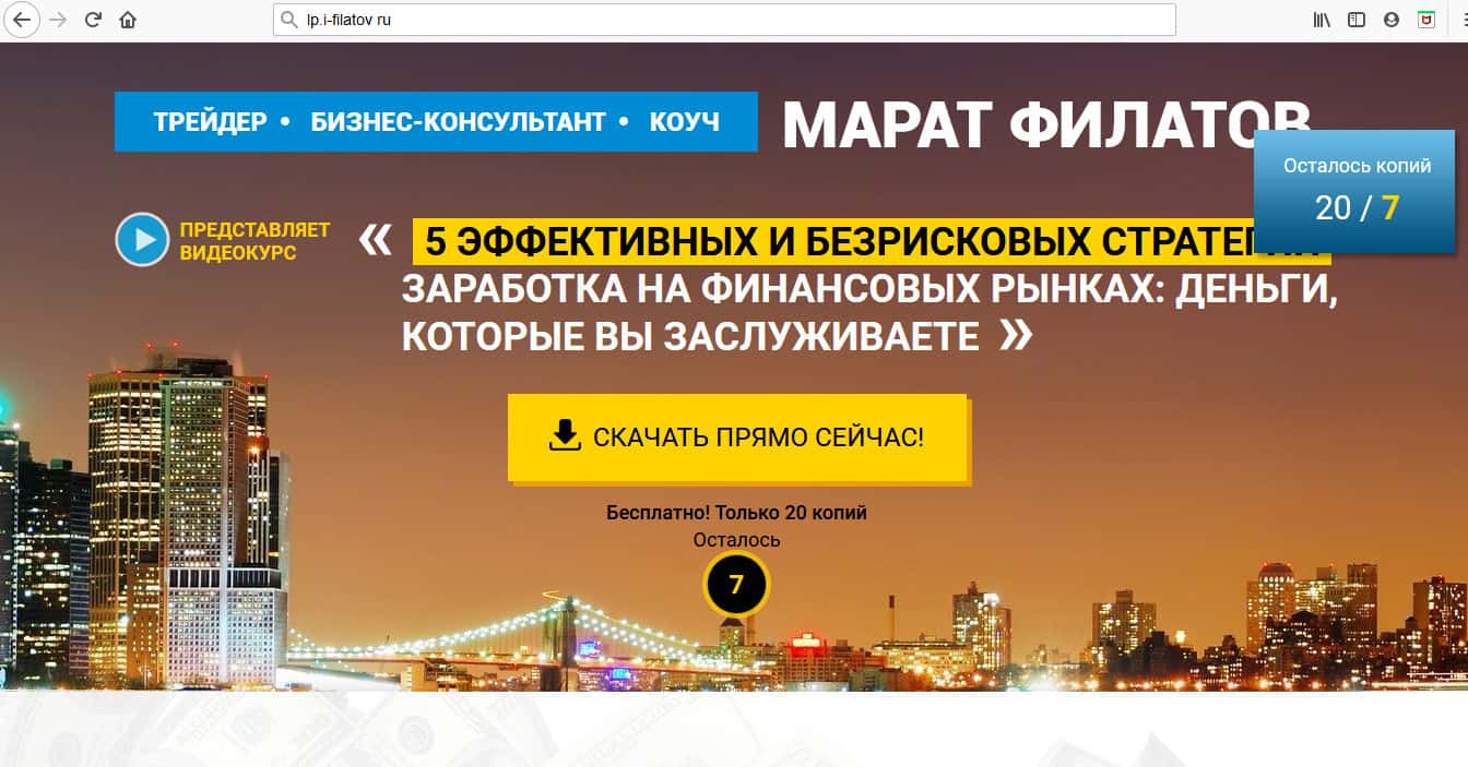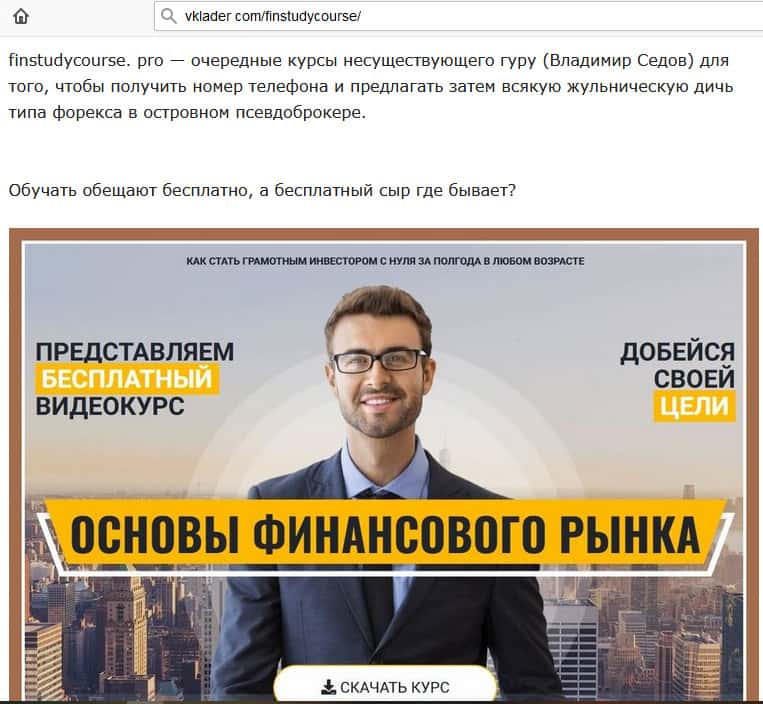 На этот раз автор курс Фин Стади Курс выпустил новый "шедевр" под названием "5 эффективных и безрисковых стратегий заработка на финансовых рынках: деньги, которые вы заслуживаете". Деньги вы, конечно, заслуживаете, но только вот не с таким мошенником, как Владимир Седов. С ним вы их можете только потерять.