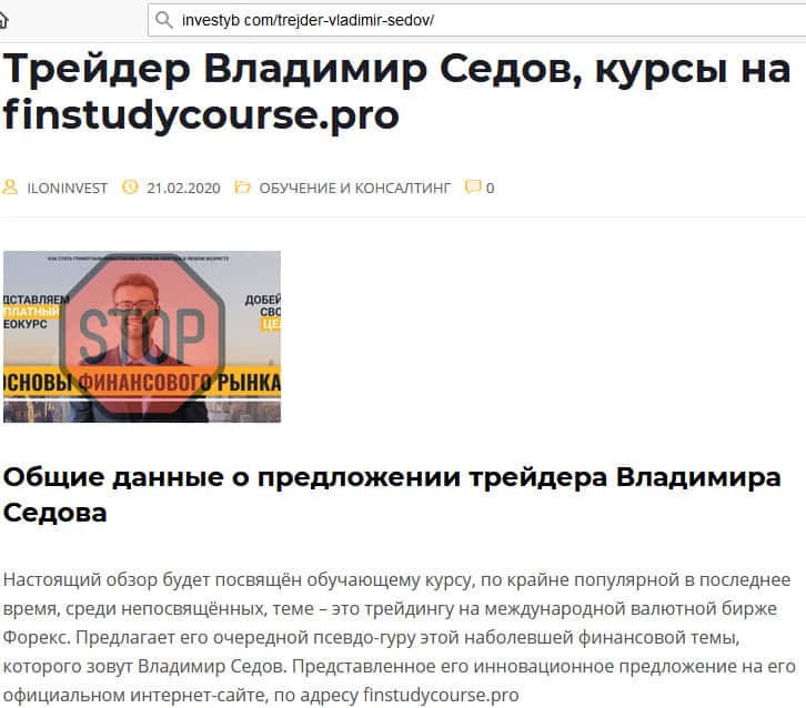Человека под именем Владимир Седов нет. Просто есть некий мошенник, который создает такие курсы, как FinStudyCourse Pro и разводит потом людей на деньги. Ничего нового нет, но в последние годы мошенничество мутировало и обрело очень много обличий: форекс, финансовые рынки, инвестиции и т.д. Любой предлог, чтобы облапошить вас на деньги.