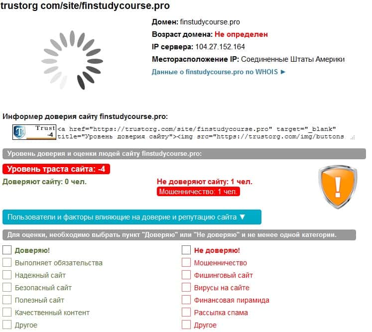 Есть такой известный сайт, как Доверие в Сети. На нем любой человек может поставить свою оценку работе той или иной компании. Так вот на нем удалены все оценки курса FinStudyCourse Pro, потому что как раз тут-то мошенник очень хорошо поработал над этим. Это уже говорит о многом.