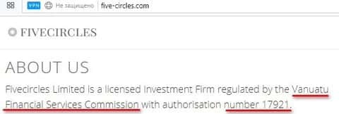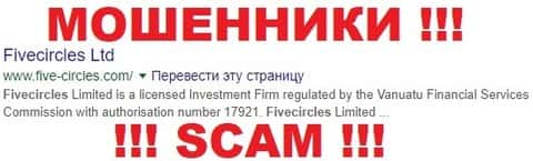 Five Circles - одна из крупных брокер кухонь, которая ведет мошенническую деятельность из зарубежья офшорной зоны Вануату и имеет множество подставных компаний-брокеров с помощью которых ей удается разводить население всех стран. Если вам попалась одна из многих дочерних-брокеров, которые будут представлены здесь - немедленно бросайте трубку и не ведитесь на уловки конторы.