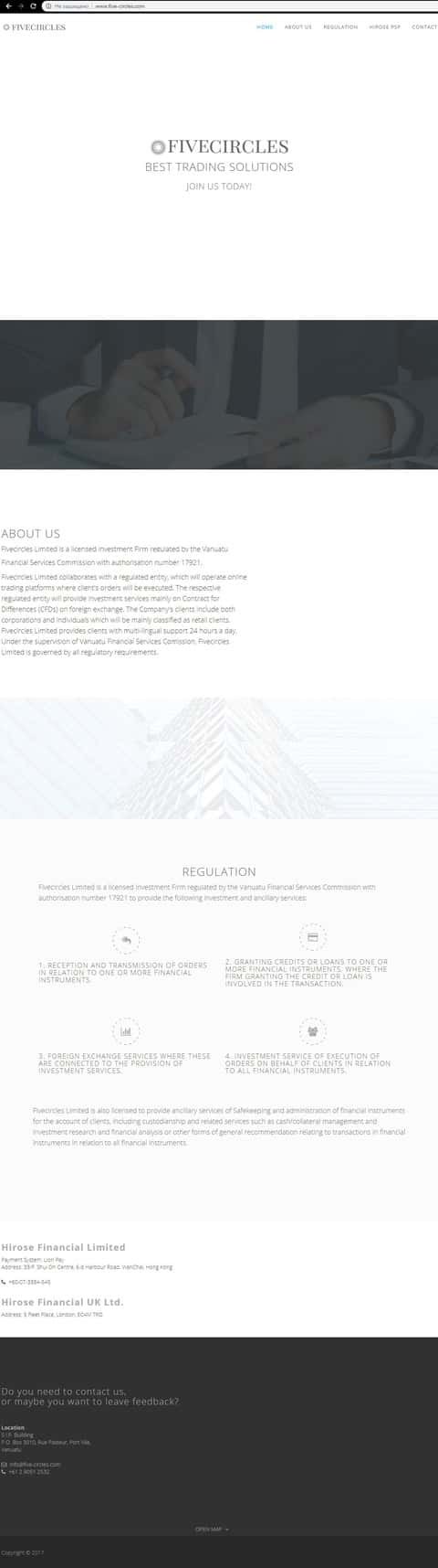 Брокерская кухня Five Circles решила особо не заморачиваться и не тратить много денег на создание полного информационного ресурса о деятельности и услугах, которые она предоставляет. Это все обусловлено тем, что контора стоит во главе мошеннической группировки и вся информация находится на всех, как минимум 6 форекс-кухонь.