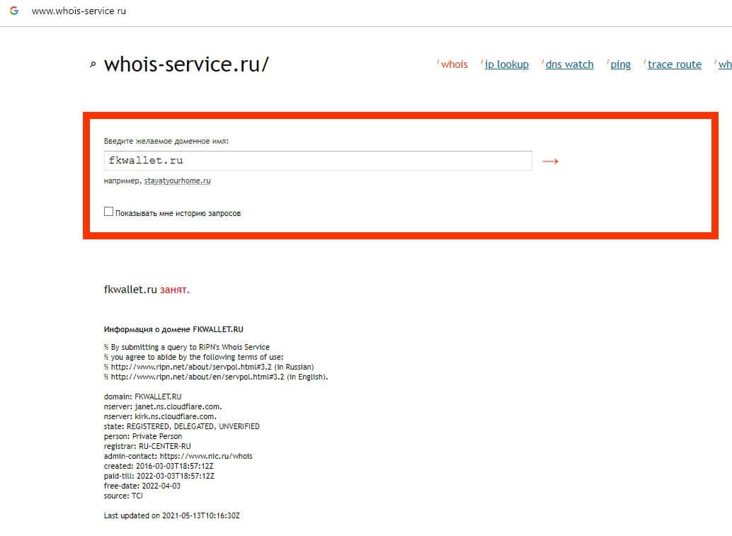 Проведя анализ данных по сайту конторы FKWallet, не было обнаружено информации о владельце домена, что является еще одним признаком того, что имеем дело с лохотроном.