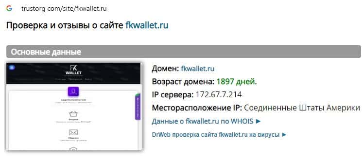Проверка интернет-сервиса аферистов FKWallet на trustorg com показала, что возраст домена к моменту написания статьи составляет 1897 дней, скорее всего домен купленный.