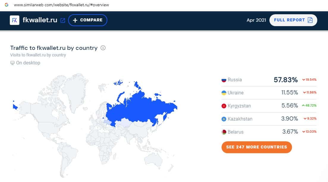 При проверке посещаемости онлайн-ресурса мошеннической организации ФК Валлет на similarweb com оказалось, что среди трафика есть пользователи из постсоветского пространства.