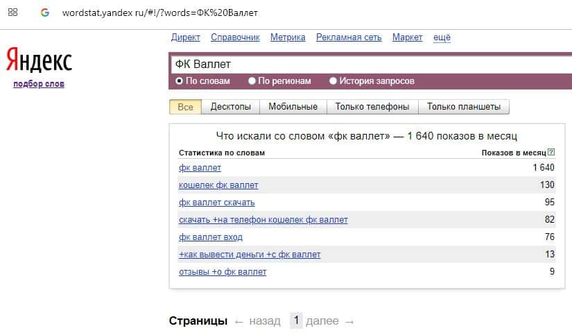 - Количество брендовых запросов FKWallet в поисковике Яндекс