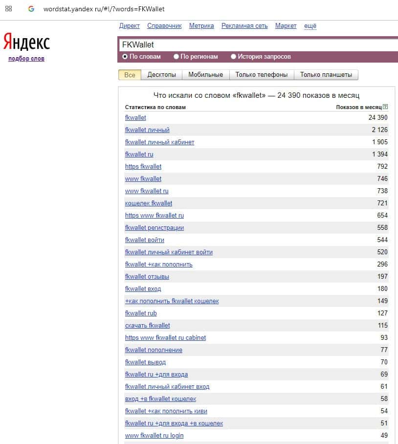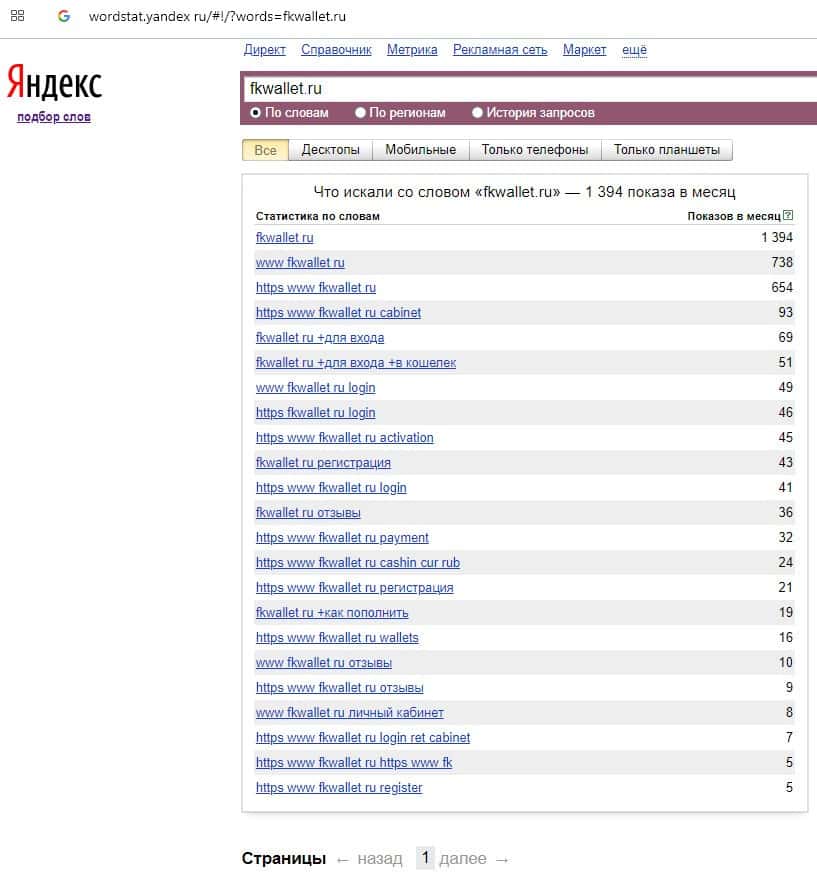 Количество запросов по бренду название домена компании "fkwallet.ru" на Вордстарт Яндекс Ру составило 1394 показа за месяц.