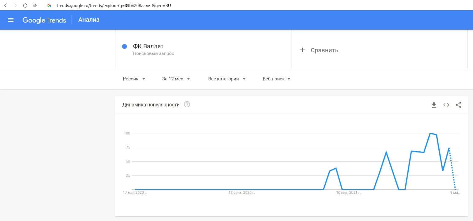 По динамике популярности брендовых запросов названия компании на русском языке "ФК Валлет" на Трендс Гугл Ру информация предоставлена на скрине ниже.