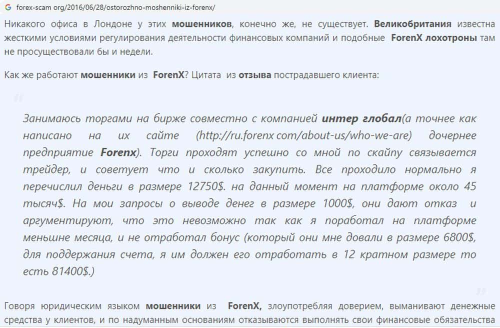Кидалы Форен Икс представлялись дочерним предприятием Интер Глобал, чтобы увеличить охват потенциальных жертв. Им предлагалась платформа с кривыми котировками, а звонари-разводилы постоянно уговаривали увеличить сумму вклада. Как только речь заходила о выводе средств, аккаунт блокировался без объяснения причин и без возврата средств.
