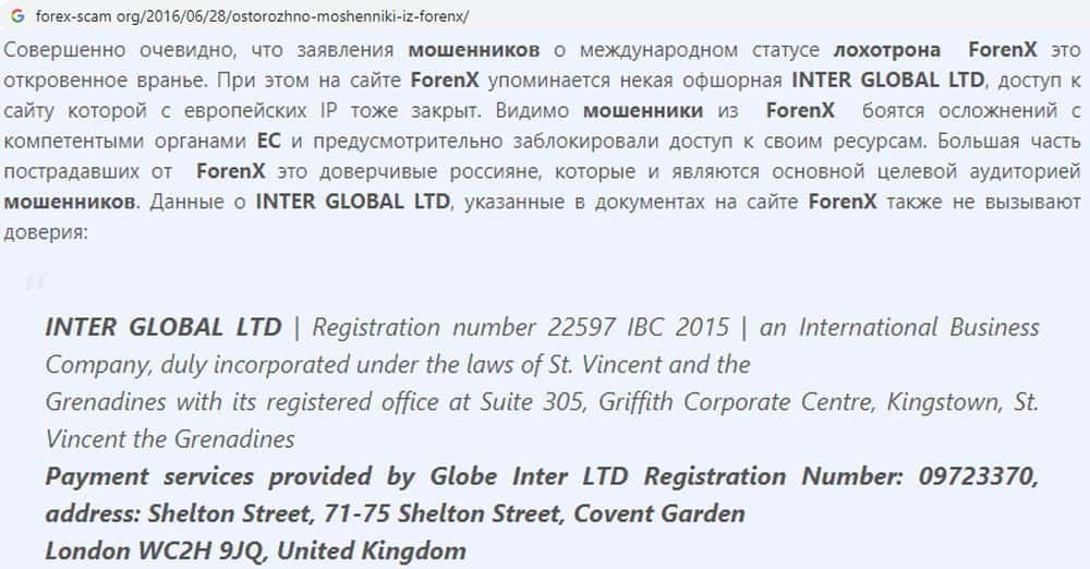 Авантюристы Форен Икс заявляли о своем якобы международном статусе. Скам-контора находилась в оффшоре, но управлялась некой организацией Inter Global Ltd. Материнская контора якобы находилась в Лондоне и имела официальную регистрацию и лицензию. Естественно, что все эти россказни - просто фейк.